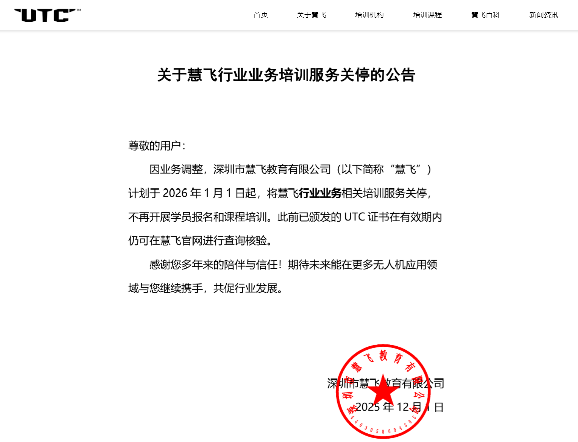 近期,无人机行业一则重磅消息引发广泛关注——大疆正式关停其UTC行业培训业务。作为无人机市场的“领头羊”,大疆的这一动作...